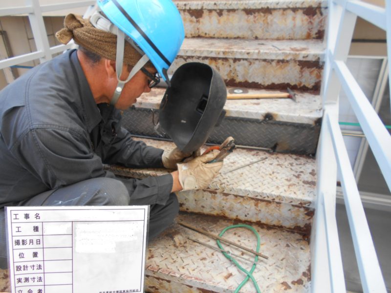 劣化して穴が開いている部分は、新たに縞鋼板を溶接し直しました。