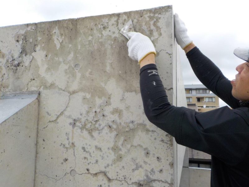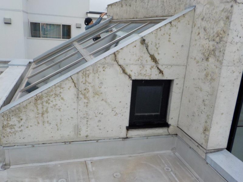 RC外壁部分にクラックがあり漏水の原因となっておりました。 不良部分に補修を行い、ウレタン塗膜防水を施工しました。 この度の施工で無事、該当箇所の漏水を止める事が出来ました。