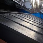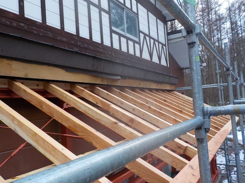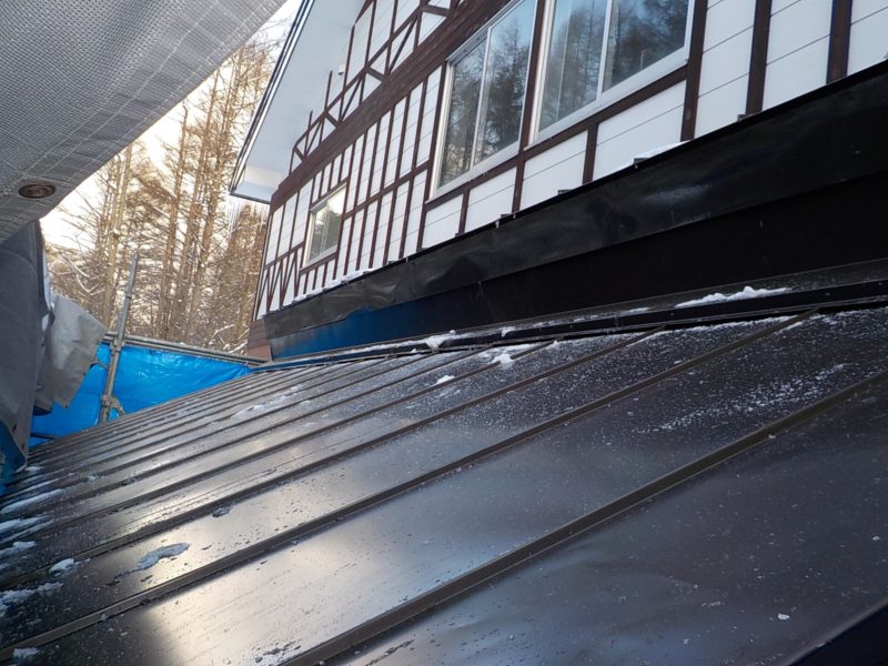 トイレ増設ということで屋根の下地は木で行い屋根は カラーステンレス鋼板で縦ハゼ葺致しました。雪は落とすようになっています。